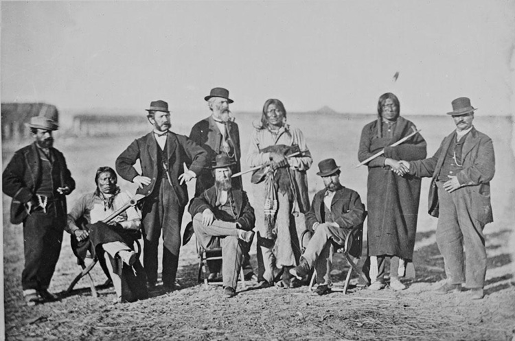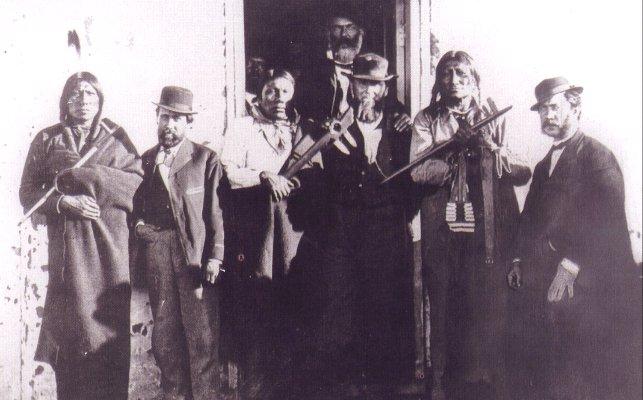Packs the Drum, often confused with Sitting Bull the Oglala, is the one with the two-bladed knife club in this Gardner photo from the 1868 Laramie council: