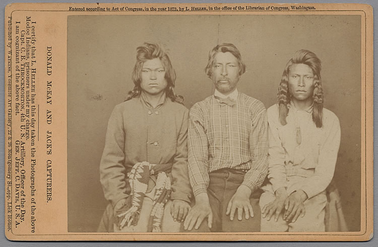 In this photo there's Donald McKay and two others Indians, Captain Jack's capturers. I think that these two men are Warm Springs, but one of my friend claims that the two warriors are two traitors Modoc. Donald McKay was leader of the Warm Springs' scouts. As a consequence, the other two guys are at right supposed to be Warm Springs, too... am I wrong? the reporter Wallace Atwill wrote: "While I am willing to give the Major all the credit he deserves, I will not permit him or any one but the real captors to have the credit of this capture. Car-pi-o-lu and We-na-shet, two Indians of Warm Spring George's division, Captain of McKay's command, captured the redoubtable chief, and to them he surrendered!". So I think that the two Indians are Car-pi-o-lu and We-na-shet, together to Donald McKay. In the book of Riddle, Winema's son, there's this picture and the caption says: "Donald McKay and two scouts". So I think that these two Indians are not prisoners, but Warm Springs scout. Also I think that their hairdo is a Warm Springs hairdo, not Modoc.